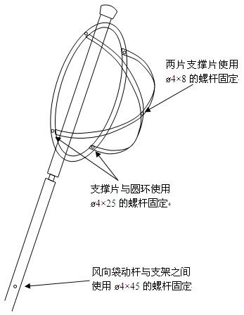 | 1、先將風袋套上不銹鋼圈。 2、再將套上風袋的鋼圈開口向下用?4*25mm固定在動桿上。 3、如下圖所示安裝支撐片。 4、將動桿插入支架,用?4*45mm螺桿固定。 5、將支架固定在底座上。 | ![]() |